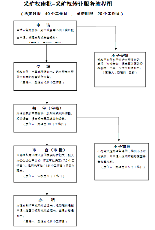 (三)审批:市国土资源局窗口自受理申请材料之日起19个工作日内,行政审批科会同矿管科等相关科室完成资料审查和会审、作出审批决定或审核上报决定。对不合符法定办理条件的,向申请人说明不能办理的原因并告知其权利。