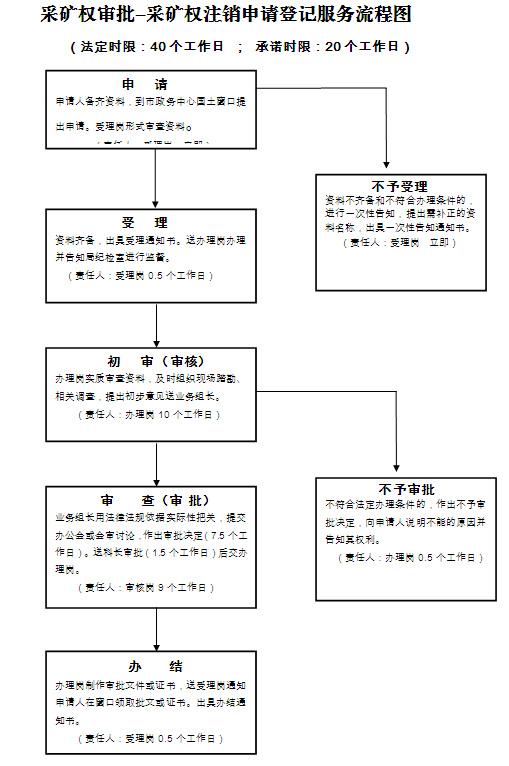 (三)审批:市国土资源局窗口自受理申请材料之日起19个工作日内,行政审批科会同矿产资源科等相关科室完成资料审查和会审、作出审批决定或审核上报决定。对不合符法定办理条件的,向申请人说明不能办理的原因并告知其权利。