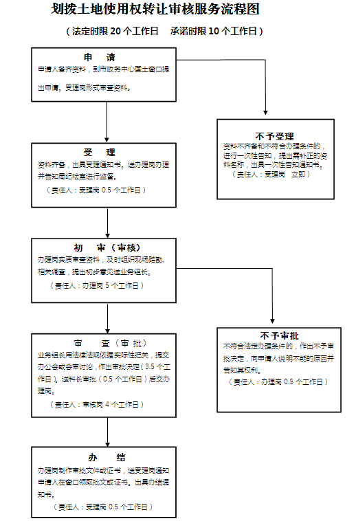 (二)受理:市国土资源局窗口受理符合法定要求的划拨土地使用权转让审核申请,0.5个工作日内出具受理通知书。对资料不齐备的,一次性告知需要补正的资料名称,出具一次性告知通知书。