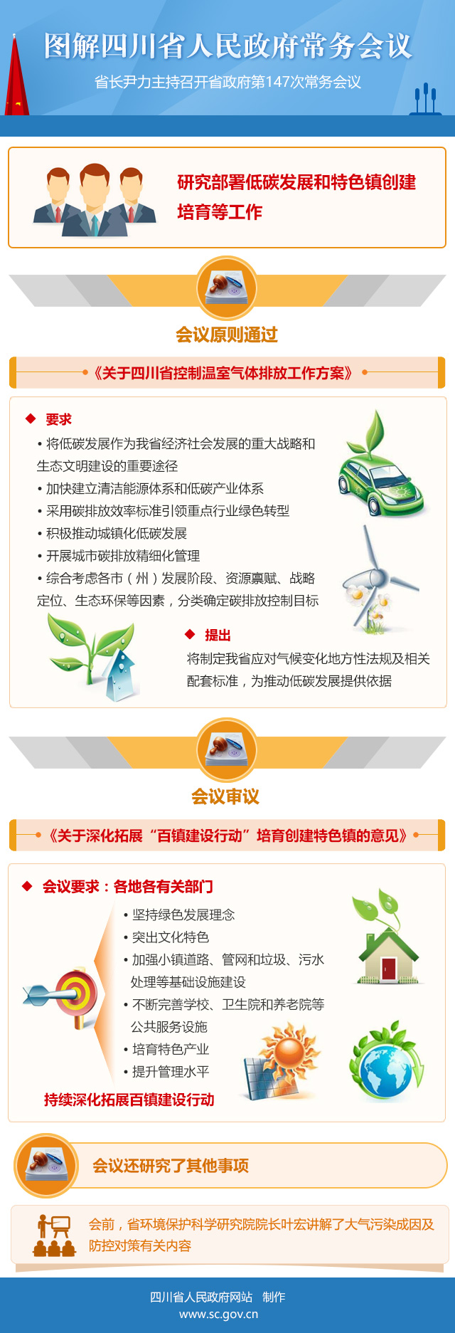 5月2日,省委副书记、省长尹力主持召开省政府第147次常务会议,研究部署低碳发展和特色镇创建培育等工作。 会议原则通过《关于四川省控制温室气体排放工作方案》,要求将低碳发展作为我省经济社会发展的重大战略和生态文明建设的重要途径,加快建立清洁能源体系和低碳产业体系,采用碳排放效率标准引领重点行业绿色转型,同时积极推动城镇化低碳发展,开展城市碳排放精细化管理,综合考虑各市(州)发展阶段、资源禀赋、战略定位、生态环保等因素,分类确定碳排放控制目标。《方案》提出,将制定我省应对气候变化地方性法规及相关配套标准,为推动低碳发展提供依据。 会议审议了《关于深化拓展“百镇建设行动”培育创建特色镇的意见》。会议要求各地各有关部门坚持绿色发展理念,突出文化特色,加强小镇道路、管网和垃圾、污水处理等基础设施建设,不断完善学校、卫生院和养老院等公共服务设施,培育特色产业,提升管理水平,持续深化拓展百镇建设行动。 会议还研究了其他事项。 本次常务会议开始前,省环境保护科学研究院院长叶宏讲解了大气污染成因及防控对策有关内容。