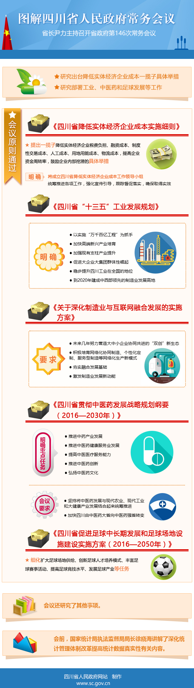 4月17日,省委副书记、省长尹力主持召开省政府第146次常务会议,研究出台降低实体经济企业成本一揽子具体举措,研究部署工业、中医药和足球发展等工作。 会议原则通过《四川省降低实体经济企业成本实施细则》,提出一揽子降低实体经济企业税费负担、融资成本、制度性交易成本、人工成本、用地用能成本、物流成本,提高企业资金周转率,鼓励企业内部挖潜的具体举措。《细则》明确,将成立四川省降低实体经济企业成本工作领导小组,统筹推进各项工作,强化宣传引导,跟踪督促落实,确保取得实效。 会议原则通过《四川省“十三五”工业发展规划》,明确将以实施“万千百亿工程”为抓手,加快高端新兴产业培育,加强现有支柱产业提升,促进大企业大集团群体性崛起,稳步提升四川工业在全国的地位,到2020年建成中西部领先的制造业发展高地。 会议原则通过《关于深化制造业与互联网融合发展的实施方案》,要求未来几年努力营造大中小企业协同共进的“双创”新生态,积极培育网络化协同制造、个性化定制、服务型制造等网络化生产新模式,夯实融合发展基础,激发制造业发展新动能。 会议原则通过《四川省贯彻中医药发展战略规划纲要(2016—2030年)》,明确推进中药产业发展、推进中医药健康服务业发展、提高中医医疗服务能力、推进中医药创新、弘扬中医药文化等重点任务。会议要求坚持将中医药发展与现代农业、现代工业和大健康产业发展结合起来统筹推进,加快四川由中医药大省向中医药强省转变。 会议原则通过《四川省促进足球中长期发展和足球场地设施建设实施方案(2016—2050年)》,细化扩大足球场地供给、创新足球人才培养模式、丰富足球赛事活动、提高足球竞技水平、发展足球产业等任务。 会议还研究了其他事项。 本次常务会议开始前,国家统计局执法监督局局长徐晓海讲解了深化统计管理体制改革提高统计数据真实性有关内容。