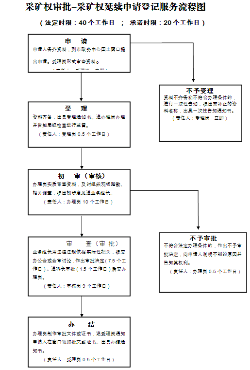 (三)审批:市国土资源局窗口自受理申请材料之日起19个工作日内,行政审批科会同矿管科等相关科室完成资料审查和会审、作出审批决定或审核上报。对不合符法定办理条件的,向申请人说明不能办理的原因并告知其权利。